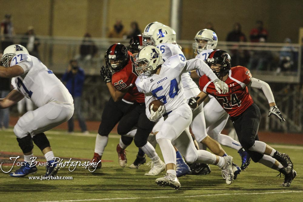 Great Bend Panther Blake Penka (#34) pursues Andover Trojan Chase Robertson (#54). The Great Bend Panthers defeated the Andover Trojans in the KSHSAA Class 5A Regional playoff game with a score of 16 to 7 at Memorial Stadium in Great Bend, Kansas on November 4, 2016. (Photo: Joey Bahr, www.joeybahr.com)undefined