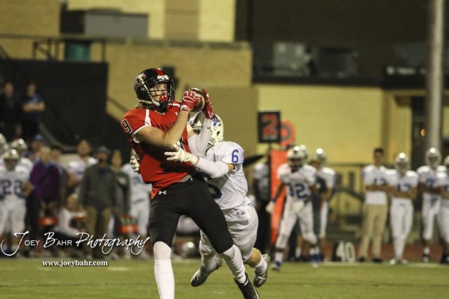 Great Bend Panther Brayden Smith (#9) pulls in a pass as Andover Trojan Evan Bell (#6) defends. The Great Bend Panthers defeated the Andover Trojans in the KSHSAA Class 5A Regional playoff game with a score of 16 to 7 at Memorial Stadium in Great Bend, Kansas on November 4, 2016. (Photo: Joey Bahr, www.joeybahr.com)undefined