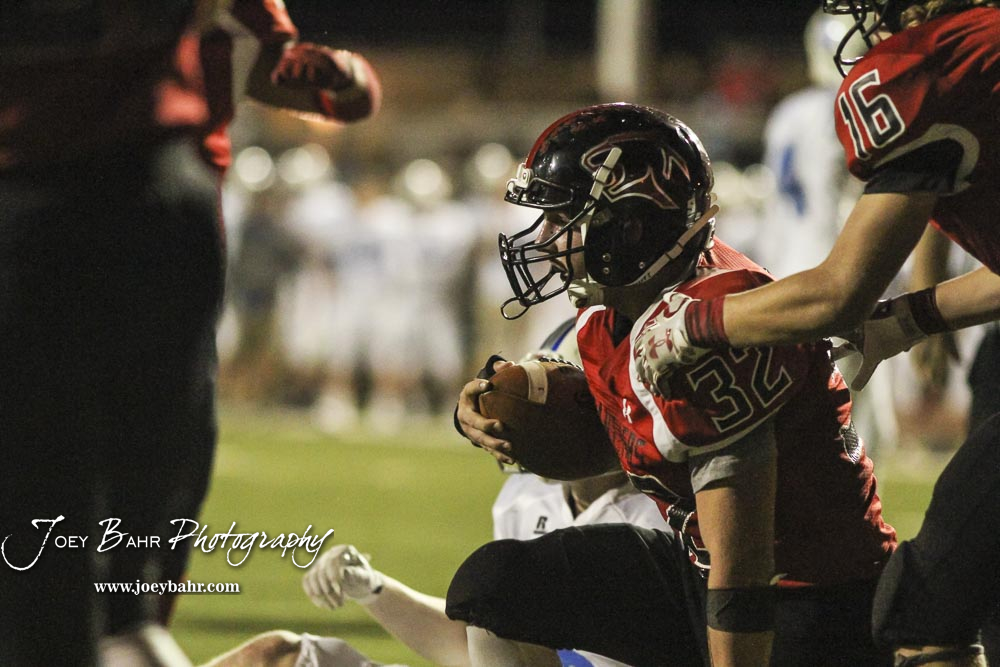 Great Bend Panther Payton Mauler (#32) kneels in the end zone with the ball he just intercepted. The Great Bend Panthers defeated the Andover Trojans in the KSHSAA Class 5A Regional playoff game with a score of 16 to 7 at Memorial Stadium in Great Bend, Kansas on November 4, 2016. (Photo: Joey Bahr, www.joeybahr.com)undefined
