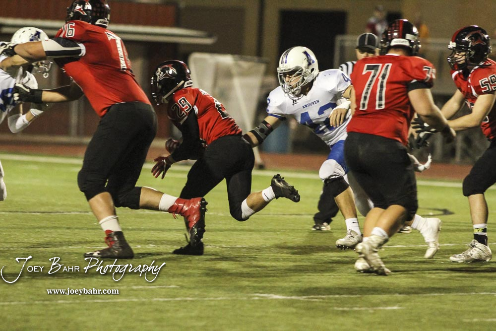Great Bend Panther Gage Fritz (#29) finds a hole in the Andover Trojan defensive line. The Great Bend Panthers defeated the Andover Trojans in the KSHSAA Class 5A Regional playoff game with a score of 16 to 7 at Memorial Stadium in Great Bend, Kansas on November 4, 2016. (Photo: Joey Bahr, www.joeybahr.com)undefined