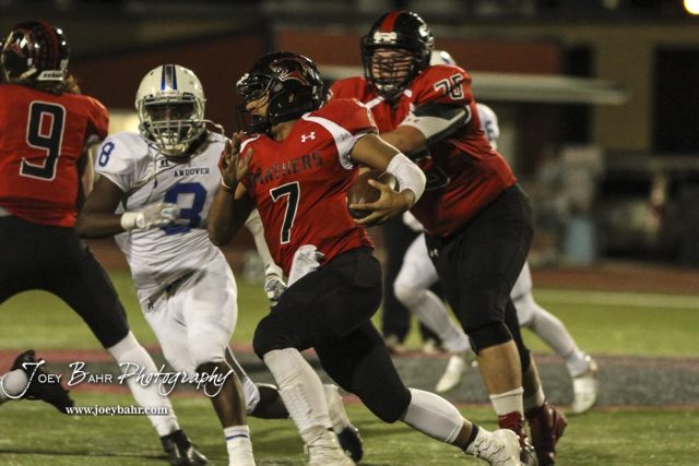 Great Bend Panther Jacob Murray (#7) runs around the corner as Andover Trojan Tyler Wright (#8) comes up to try and tackle him. The Great Bend Panthers defeated the Andover Trojans in the KSHSAA Class 5A Regional playoff game with a score of 16 to 7 at Memorial Stadium in Great Bend, Kansas on November 4, 2016. (Photo: Joey Bahr, www.joeybahr.com)undefined