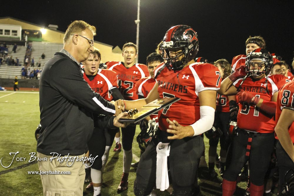 Great Bend Athletic Director David Meter presents the Class 5A Regional Champion Trophy to Great Bend Panther Jacob Murray (#7). The Great Bend Panthers defeated the Andover Trojans in the KSHSAA Class 5A Regional playoff game with a score of 16 to 7 at Memorial Stadium in Great Bend, Kansas on November 4, 2016. (Photo: Joey Bahr, www.joeybahr.com)undefined