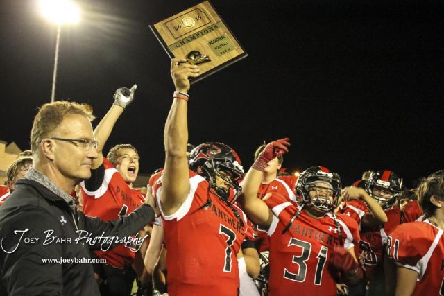 Great Bend Panther Jacob Murray (#7) holds up the Class 5A Regional Champion Trophy. The Great Bend Panthers defeated the Andover Trojans in the KSHSAA Class 5A Regional playoff game with a score of 16 to 7 at Memorial Stadium in Great Bend, Kansas on November 4, 2016. (Photo: Joey Bahr, www.joeybahr.com)undefined