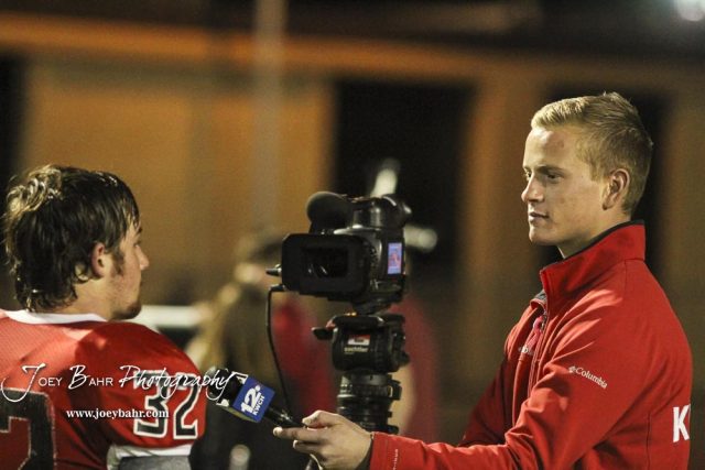 KWCH Reporter, Gardner Royce, interviews Great Bend Panther Payton Mauler (#32) following the game. The Great Bend Panthers defeated the Andover Trojans in the KSHSAA Class 5A Regional playoff game with a score of 16 to 7 at Memorial Stadium in Great Bend, Kansas on November 4, 2016. (Photo: Joey Bahr, www.joeybahr.com)undefined