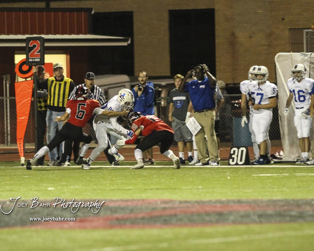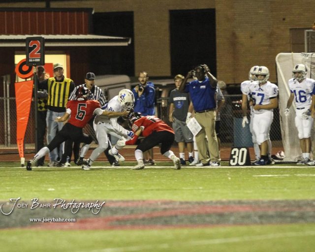 Great Bend Panthers Max Jerke (#6) and Nick Reed (#15) tackle Andover Trojan Ben Smith (#88). The Great Bend Panthers defeated the Andover Trojans in the KSHSAA Class 5A Regional playoff game with a score of 16 to 7 at Memorial Stadium in Great Bend, Kansas on November 4, 2016. (Photo: Joey Bahr, www.joeybahr.com)undefined
