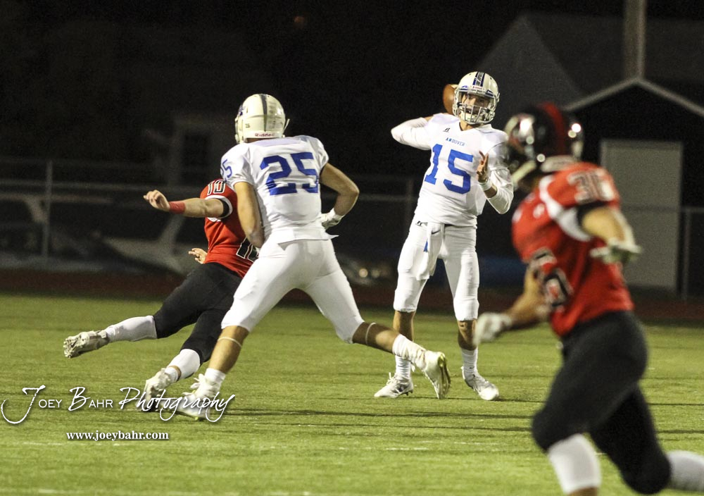 Andover Trojan Chase Oberg (#15) throws a pass. The Great Bend Panthers defeated the Andover Trojans in the KSHSAA Class 5A Regional playoff game with a score of 16 to 7 at Memorial Stadium in Great Bend, Kansas on November 4, 2016. (Photo: Joey Bahr, www.joeybahr.com)undefined