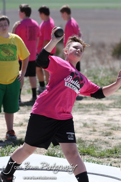 Competitors take part in the 7th Grade Girls Shot Put at the Oiler Relays at Barton Community College in Great Bend, Kansas on April 4, 2013. (Photo: Joey Bahr, www.joeybahr.com)