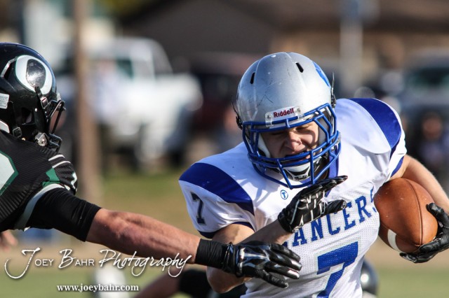 Spearville Lancer Brandon Davis (#7) tries to run past a Central Plains Oiler defender during the KSHSAA Eight Man Division I Regional Football game between Spearville and Central Plains with Central Plains winning 42 to 40 at Central Plains High School in Claflin, Kansas on November 8, 2014. (Photo: Joey Bahr, www.joeybahr.com)