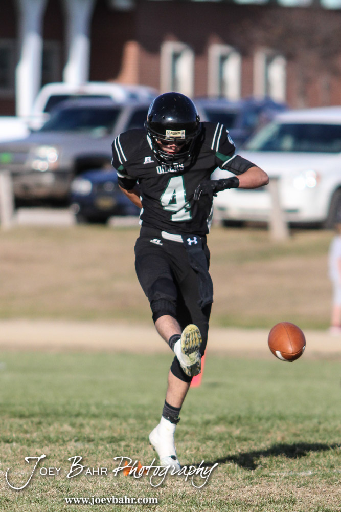 Central Plains Oiler Hunter Ingham (#4) kicks the ball off during the KSHSAA Eight Man Division I Regional Football game between Spearville and Central Plains with Central Plains winning 42 to 40 at Central Plains High School in Claflin, Kansas on November 8, 2014. (Photo: Joey Bahr, www.joeybahr.com)