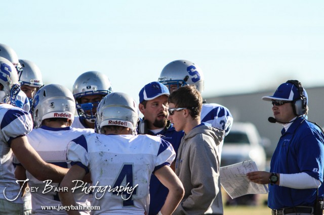 Spearville Lancer Head Coach Matt Fowler talks to his players during the KSHSAA Eight Man Division I Regional Football game between Spearville and Central Plains with Central Plains winning 42 to 40 at Central Plains High School in Claflin, Kansas on November 8, 2014. (Photo: Joey Bahr, www.joeybahr.com)
