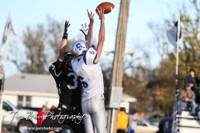 Spearville Lancer Clinton Stein (#6) jumps to break up a pass to Central Plains Oiler Layne Bieberle (#3) during the KSHSAA Eight Man Division I Regional Football game between Spearville and Central Plains with Central Plains winning 42 to 40 at Central Plains High School in Claflin, Kansas on November 8, 2014. (Photo: Joey Bahr, www.joeybahr.com)