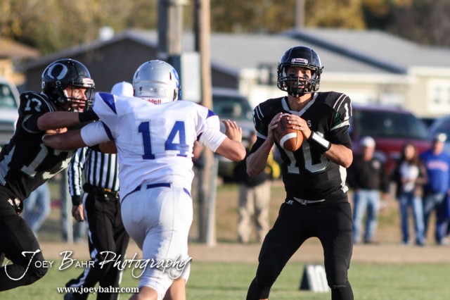 Central Plains Oiler Braedan Crites (#10) looks for an open receiver during the KSHSAA Eight Man Division I Regional Football game between Spearville and Central Plains with Central Plains winning 42 to 40 at Central Plains High School in Claflin, Kansas on November 8, 2014. (Photo: Joey Bahr, www.joeybahr.com)
