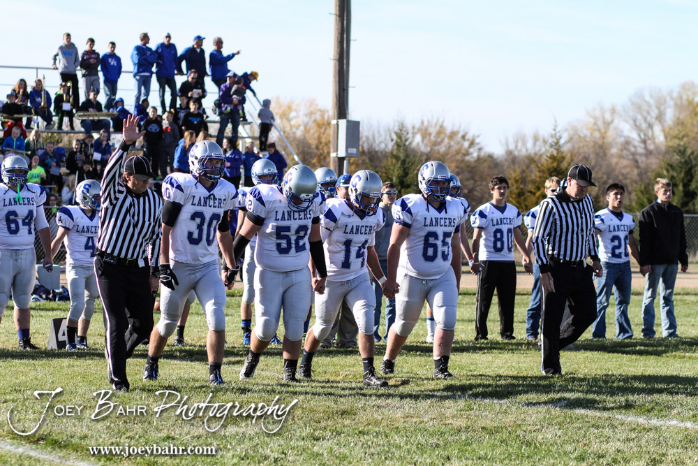 The Spearville Lancer Captains walk to mid-field during the KSHSAA Eight Man Division I Regional Football game between Spearville and Central Plains with Central Plains winning 42 to 40 at Central Plains High School in Claflin, Kansas on November 8, 2014. (Photo: Joey Bahr, www.joeybahr.com)