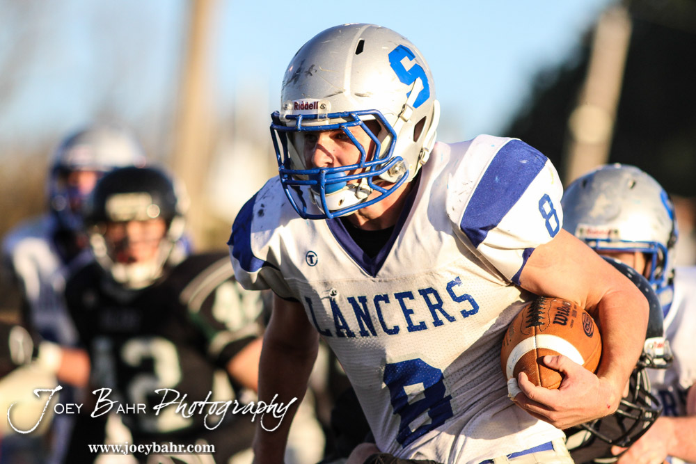 Spearville Lancer Nathan Stein (#8) runs with the ball during the KSHSAA Eight Man Division I Regional Football game between Spearville and Central Plains with Central Plains winning 42 to 40 at Central Plains High School in Claflin, Kansas on November 8, 2014. (Photo: Joey Bahr, www.joeybahr.com)