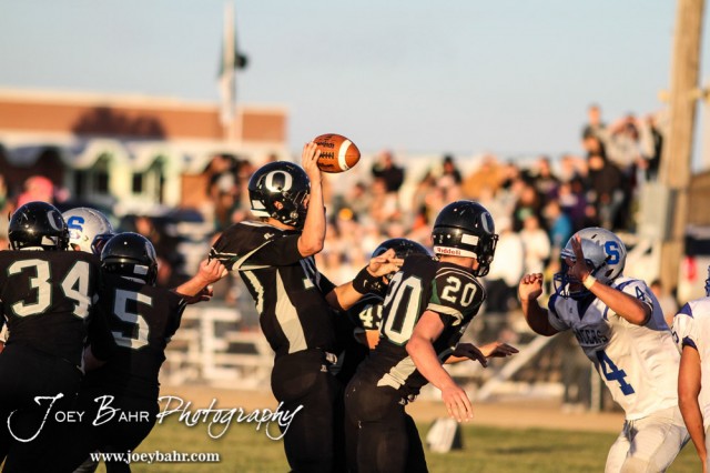 A Spearville Lancer pulls on the jersey of Central Plains Oiler Braedan Crites (#10) as he goes to throw a pass during the KSHSAA Eight Man Division I Regional Football game between Spearville and Central Plains with Central Plains winning 42 to 40 at Central Plains High School in Claflin, Kansas on November 8, 2014. (Photo: Joey Bahr, www.joeybahr.com)