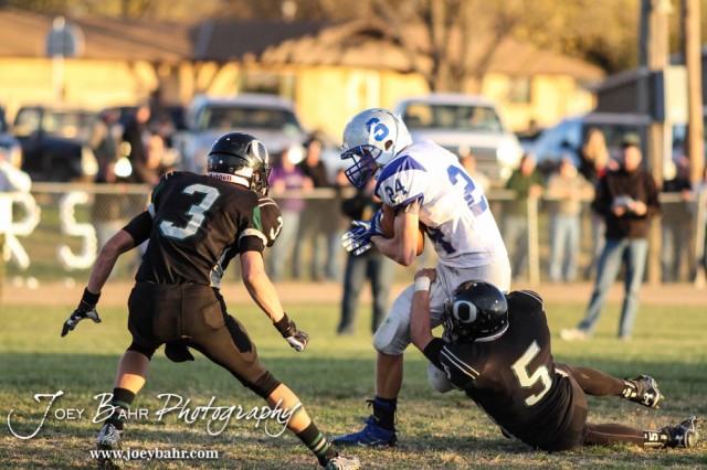 Central Plains Oiler Jacob Warnken (#5) tackles Spearville Lancer Hunter Stephenson (#24) during the KSHSAA Eight Man Division I Regional Football game between Spearville and Central Plains with Central Plains winning 42 to 40 at Central Plains High School in Claflin, Kansas on November 8, 2014. (Photo: Joey Bahr, www.joeybahr.com)