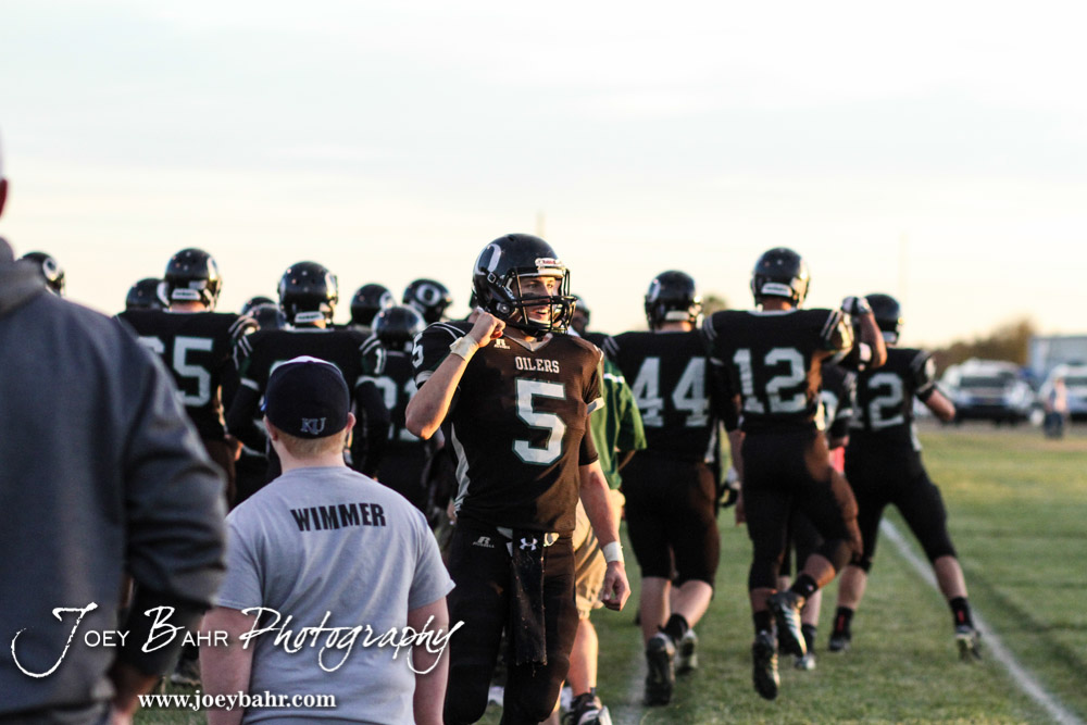 Central Plains Oiler Jacob Warnken (#5) celebrates winning the KSHSAA Eight Man Division I Regional Football game between Spearville and Central Plains with Central Plains winning 42 to 40 at Central Plains High School in Claflin, Kansas on November 8, 2014. (Photo: Joey Bahr, www.joeybahr.com)