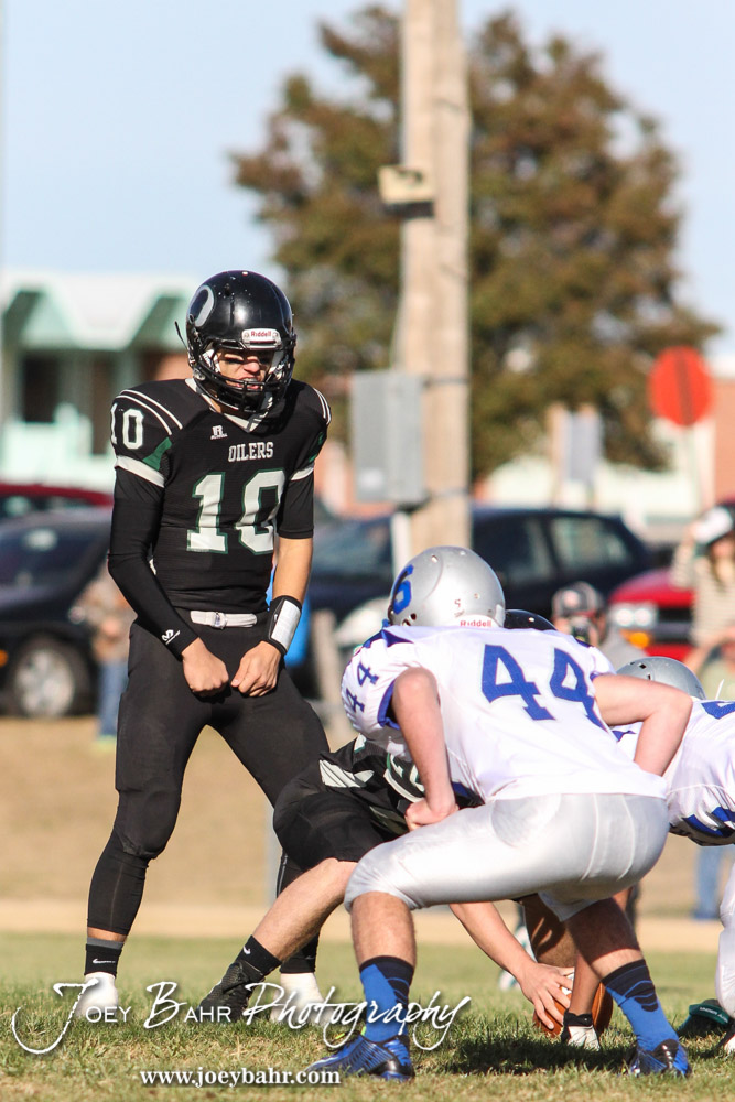 Central Plains Oiler Braedan Crites (#10) prepares to go under the Center during the KSHSAA Eight Man Division I Regional Football game between Spearville and Central Plains with Central Plains winning 42 to 40 at Central Plains High School in Claflin, Kansas on November 8, 2014. (Photo: Joey Bahr, www.joeybahr.com)