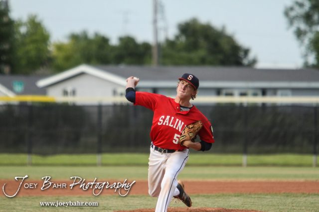 Salina Post 62 Falcon #5 Kody Berry throws a pitch. The Salina Falcons defeated Emporia 4 to 2 in First Round of the American Legion Class AAA Baseball State Tournament Championship at the Great Bend Sports Complex in Great Bend, Kansas on July 27, 2016. (Photo: Joey Bahr, www.joeybahr.com)undefined
