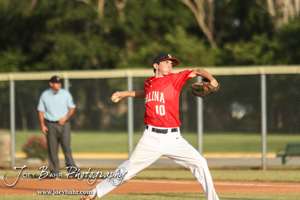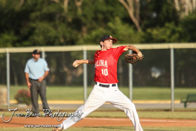 Salina Post 62 Falcon #10 Cade Sterrett throws a pitch. The Salina Falcons defeated Emporia 4 to 2 in First Round of the American Legion Class AAA Baseball State Tournament Championship at the Great Bend Sports Complex in Great Bend, Kansas on July 27, 2016. (Photo: Joey Bahr, www.joeybahr.com)undefined