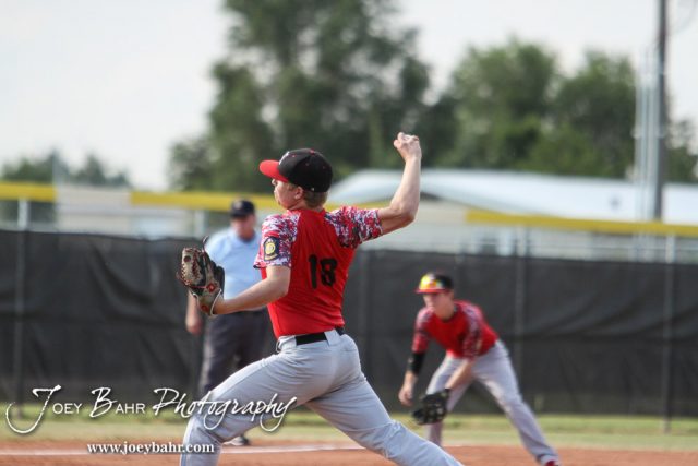 Emporia Post 5 #18 Alex Croucher throws a pitch. The Salina Falcons defeated Emporia 4 to 2 in First Round of the American Legion Class AAA Baseball State Tournament Championship at the Great Bend Sports Complex in Great Bend, Kansas on July 27, 2016. (Photo: Joey Bahr, www.joeybahr.com)undefined