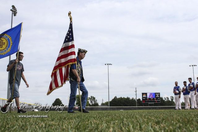 Members of the American Legion Post 180 Honor Guard take the colors onto the field prior to the start of the AAA Zone Tournament. The McPherson American Legion Post 24 AAA Seniors defeated the Hutchinson American Legion Post 68 AAA Colts 6 to 4 to advance to the AAA Zone 8 Championship at the Great Bend Sports Complex in Great Bend, Kansas on July 15, 2017. (Photo: Joey Bahr, www.joeybahr.com)undefined