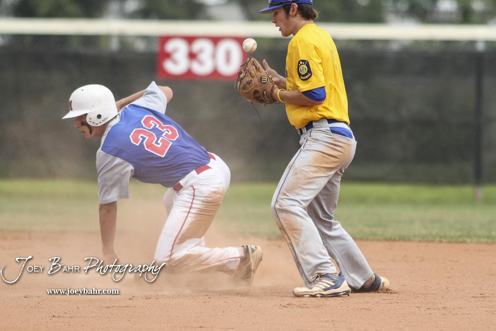 McPherson Senior Dylan Werries (#23) slides past second base as Hutchinson Colt Wyatt Akins (#4) juggles the ball in the bottom of the first inning. The McPherson American Legion Post 24 AAA Seniors defeated the Hutchinson American Legion Post 68 AAA Colts 6 to 4 to advance to the AAA Zone 8 Championship at the Great Bend Sports Complex in Great Bend, Kansas on July 15, 2017. (Photo: Joey Bahr, www.joeybahr.com)undefined