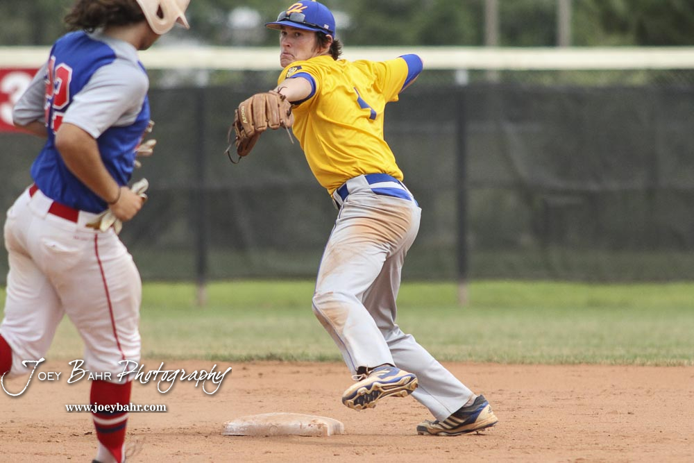 Hutchinson Colt Wyatt Akins (#4) tries to complete a double play after getting McPherson Senior Alex Kalkhorst (#22) out with a force out at second base in the bottom of the first inning. The McPherson American Legion Post 24 AAA Seniors defeated the Hutchinson American Legion Post 68 AAA Colts 6 to 4 to advance to the AAA Zone 8 Championship at the Great Bend Sports Complex in Great Bend, Kansas on July 15, 2017. (Photo: Joey Bahr, www.joeybahr.com)undefined