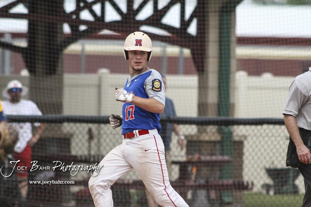 McPherson Senior Mikey Saverino (#17) looks back at first base to see that the run he just scored was wiped off the board due to a 6-3 play at first base in the bottom of the second inning. The McPherson American Legion Post 24 AAA Seniors defeated the Hutchinson American Legion Post 68 AAA Colts 6 to 4 to advance to the AAA Zone 8 Championship at the Great Bend Sports Complex in Great Bend, Kansas on July 15, 2017. (Photo: Joey Bahr, www.joeybahr.com)undefined