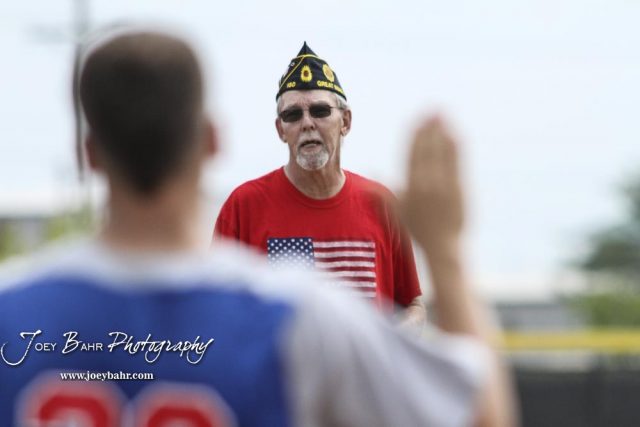 A representative of American Legion Post 180 administers the Oath of Sportsmanship. The McPherson American Legion Post 24 AAA Seniors defeated the Hutchinson American Legion Post 68 AAA Colts 6 to 4 to advance to the AAA Zone 8 Championship at the Great Bend Sports Complex in Great Bend, Kansas on July 15, 2017. (Photo: Joey Bahr, www.joeybahr.com)undefined