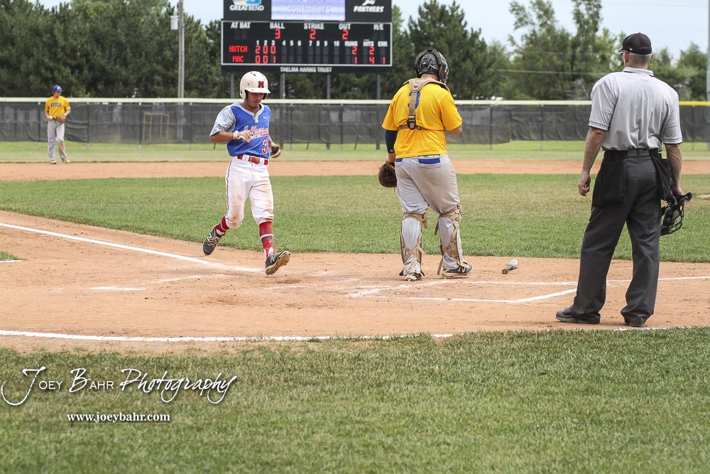 McPherson Senior Alex Sitts (#3) crosses home to score a tying run in the bottom of the third inning. The McPherson American Legion Post 24 AAA Seniors defeated the Hutchinson American Legion Post 68 AAA Colts 6 to 4 to advance to the AAA Zone 8 Championship at the Great Bend Sports Complex in Great Bend, Kansas on July 15, 2017. (Photo: Joey Bahr, www.joeybahr.com)undefined