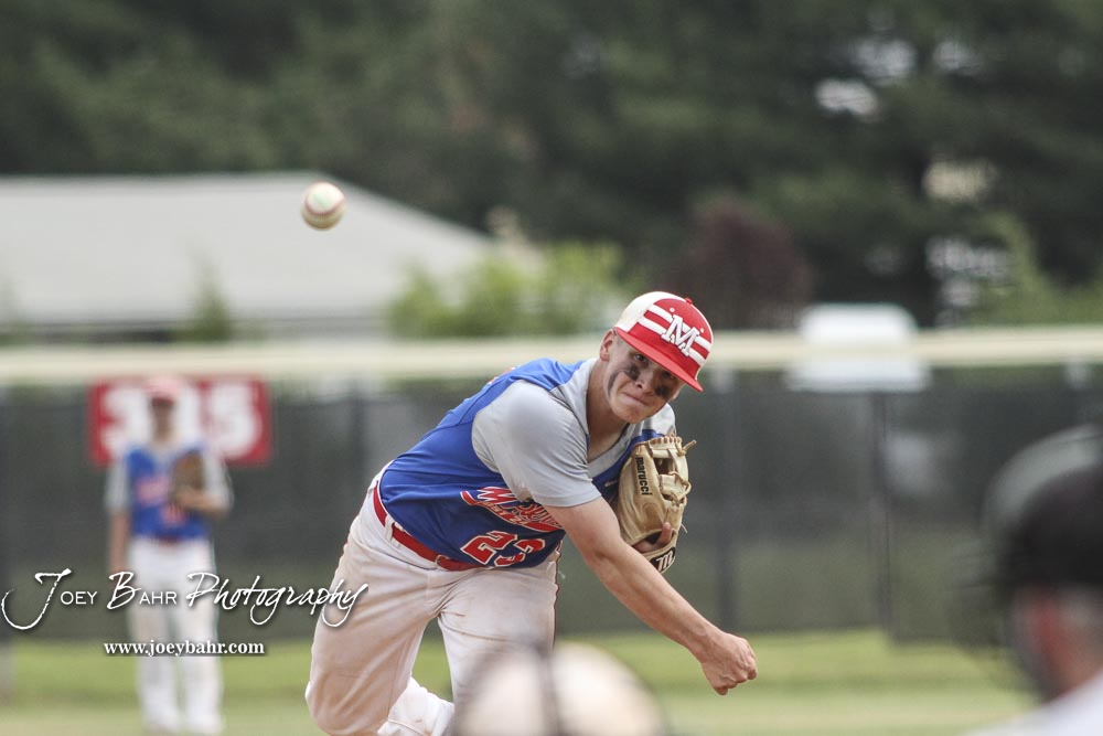 McPherson Senior Dylan Werries (#23) throws a pitch top of the fourth inning. The McPherson American Legion Post 24 AAA Seniors defeated the Hutchinson American Legion Post 68 AAA Colts 6 to 4 to advance to the AAA Zone 8 Championship at the Great Bend Sports Complex in Great Bend, Kansas on July 15, 2017. (Photo: Joey Bahr, www.joeybahr.com)undefined