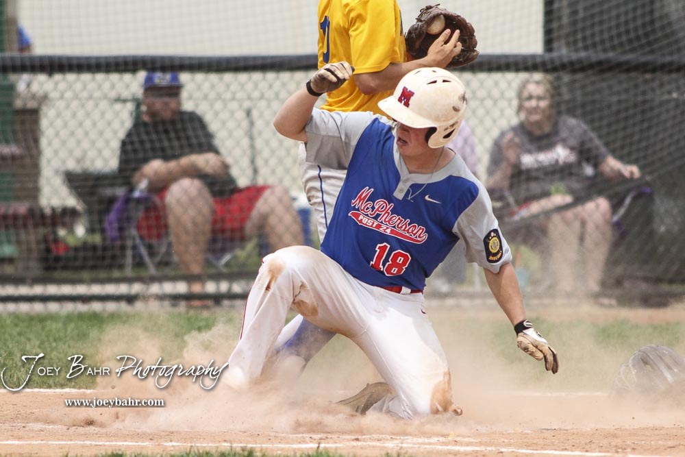 McPherson Senior Jack Reifschneider (#18) scores a run on a passed ball play in the bottom of the fifth inning. The McPherson American Legion Post 24 AAA Seniors defeated the Hutchinson American Legion Post 68 AAA Colts 6 to 4 to advance to the AAA Zone 8 Championship at the Great Bend Sports Complex in Great Bend, Kansas on July 15, 2017. (Photo: Joey Bahr, www.joeybahr.com)undefined
