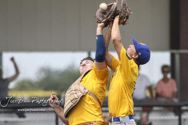 Hutchinson Colt Jace Armstrong (#10) runs into his catcher Palmer Hutchinson (#3) as they both go for a pop up foul ball in the bottom of the sixth inning. The McPherson American Legion Post 24 AAA Seniors defeated the Hutchinson American Legion Post 68 AAA Colts 6 to 4 to advance to the AAA Zone 8 Championship at the Great Bend Sports Complex in Great Bend, Kansas on July 15, 2017. (Photo: Joey Bahr, www.joeybahr.com)undefined