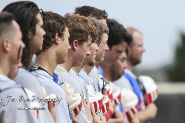 The McPherson Seniors look towards the flag during the National Anthem. The McPherson American Legion Post 24 AAA Seniors defeated the Hutchinson American Legion Post 68 AAA Colts 6 to 4 to advance to the AAA Zone 8 Championship at the Great Bend Sports Complex in Great Bend, Kansas on July 15, 2017. (Photo: Joey Bahr, www.joeybahr.com)undefined