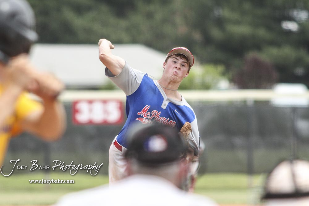 McPherson Senior Jack Reifschneider (#18) throws a pitch in the top of the seventh inning. The McPherson American Legion Post 24 AAA Seniors defeated the Hutchinson American Legion Post 68 AAA Colts 6 to 4 to advance to the AAA Zone 8 Championship at the Great Bend Sports Complex in Great Bend, Kansas on July 15, 2017. (Photo: Joey Bahr, www.joeybahr.com)undefined