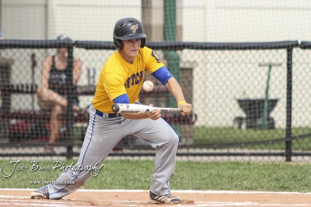 Hutchinson Colt Wyatt Akins (#4) lays down a bunt in the top of the first inning. The McPherson American Legion Post 24 AAA Seniors defeated the Hutchinson American Legion Post 68 AAA Colts 6 to 4 to advance to the AAA Zone 8 Championship at the Great Bend Sports Complex in Great Bend, Kansas on July 15, 2017. (Photo: Joey Bahr, www.joeybahr.com)undefined