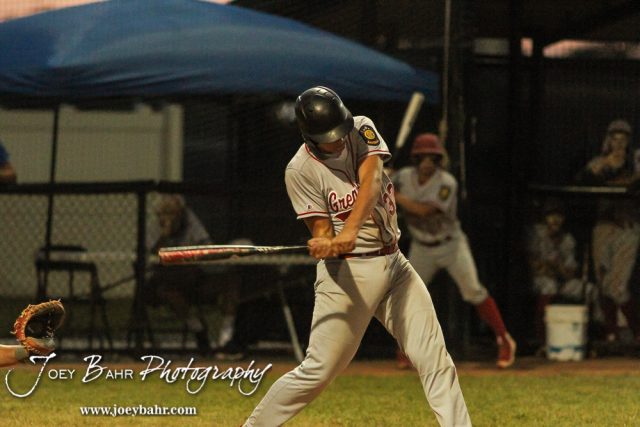 Great Bend Braves #32 Blaine Mermis takes a swing at a pitch. The Great Bend Braves won their first round game over Doniphan County 14 to 4 in the American Legional Class A Baseball State Tournament at the Great Bend Sports Complex in Great Bend, Kansas on July 20, 2016. (Photo: Joey Bahr, www.joeybahr.com)undefined