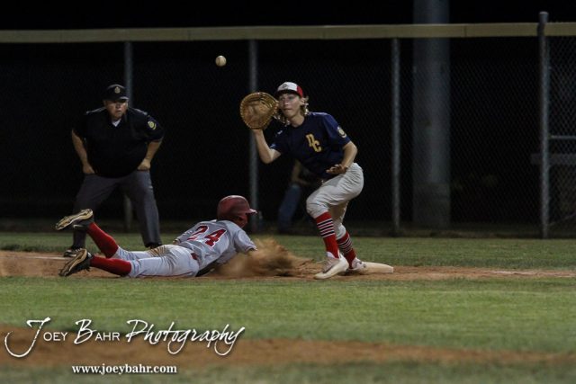 Doniphan County #15 Zebadiah Speer readies to catch the ball as Great Bend Braves #24 Dalton Bieker gets back from his lead off. The Great Bend Braves won their first round game over Doniphan County 14 to 4 in the American Legional Class A Baseball State Tournament at the Great Bend Sports Complex in Great Bend, Kansas on July 20, 2016. (Photo: Joey Bahr, www.joeybahr.com)undefined
