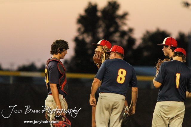 Doniphan County Head Coach Jeffrey Watts talks to his pitcher after a rough start in the top of the First Inning. The Great Bend Braves won their first round game over Doniphan County 14 to 4 in the American Legional Class A Baseball State Tournament at the Great Bend Sports Complex in Great Bend, Kansas on July 20, 2016. (Photo: Joey Bahr, www.joeybahr.com)undefined