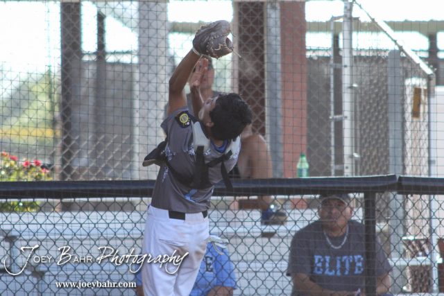 Garden City Elite Aric Rowland (#1) catches a foul ball at the backstop. The Great Bend Chiefs won the AAA Lower Zone 1 & 2 Tournament by defeating the Garden City Elite 10 to 4 at Great Bend Sports Complex in Great Bend, Kansas on July 18, 2016. (Photo: Joey Bahr, www.joeybahr.com)undefined