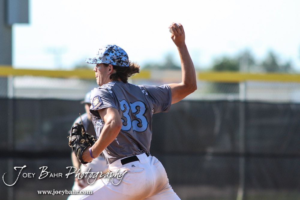 Garden City Elite Sloan Baker (#33) throws a pitch in the top of the First Inning. The Great Bend Chiefs won the AAA Lower Zone 1 & 2 Tournament by defeating the Garden City Elite 10 to 4 at Great Bend Sports Complex in Great Bend, Kansas on July 18, 2016. (Photo: Joey Bahr, www.joeybahr.com)undefined