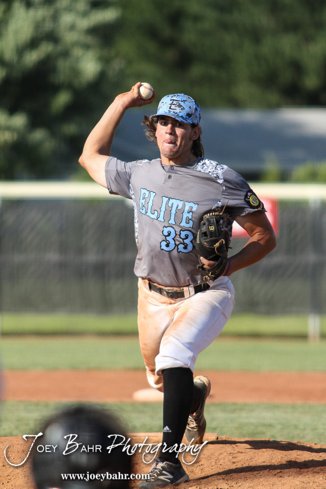 Garden City Elite Sloan Baker (#33) throws a pitch in the bottom of the Fifth Inning. The Great Bend Chiefs won the AAA Lower Zone 1 & 2 Tournament by defeating the Garden City Elite 10 to 4 at Great Bend Sports Complex in Great Bend, Kansas on July 18, 2016. (Photo: Joey Bahr, www.joeybahr.com)undefined