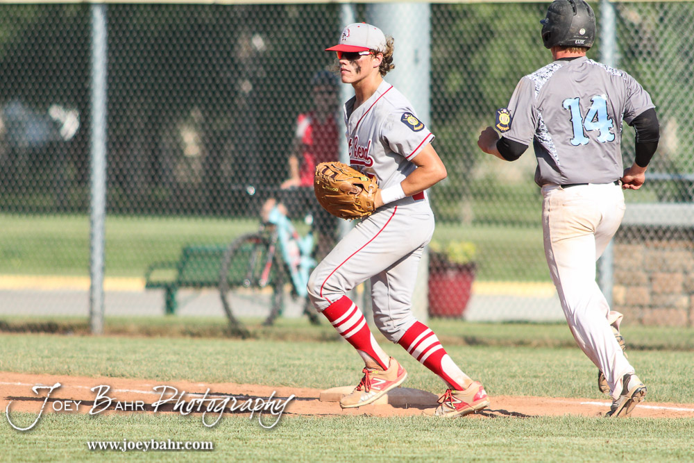 Great Bend Chief Jared Maneth (#17) gets the out at First on Garden City Elite Casey English (#14) in the Fourth Inning. The Great Bend Chiefs won the AAA Lower Zone 1 & 2 Tournament by defeating the Garden City Elite 10 to 4 at Great Bend Sports Complex in Great Bend, Kansas on July 18, 2016. (Photo: Joey Bahr, www.joeybahr.com)undefined