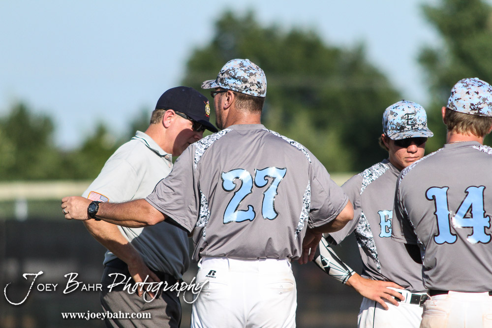 Garden City Elite Head Coach Lyle Befort discusses a call with an umpire. The Great Bend Chiefs won the AAA Lower Zone 1 & 2 Tournament by defeating the Garden City Elite 10 to 4 at Great Bend Sports Complex in Great Bend, Kansas on July 18, 2016. (Photo: Joey Bahr, www.joeybahr.com)undefined