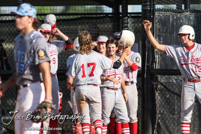 Great Bend Chief Jared Maneth (#17) celebrates with his teammates after scoring a run in the top of the Fifth Inning on a wild pitch. The Great Bend Chiefs won the AAA Lower Zone 1 & 2 Tournament by defeating the Garden City Elite 10 to 4 at Great Bend Sports Complex in Great Bend, Kansas on July 18, 2016. (Photo: Joey Bahr, www.joeybahr.com)undefined