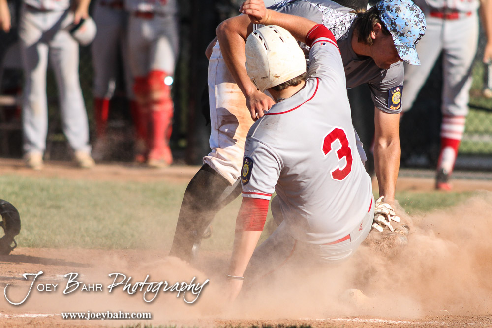 Garden City Elite Sloan Baker (#33) tags Great Bend Chief Jaxx Hillman (#3) out at home plate as he tried to score on a wild pitch. The Great Bend Chiefs won the AAA Lower Zone 1 & 2 Tournament by defeating the Garden City Elite 10 to 4 at Great Bend Sports Complex in Great Bend, Kansas on July 18, 2016. (Photo: Joey Bahr, www.joeybahr.com)undefined