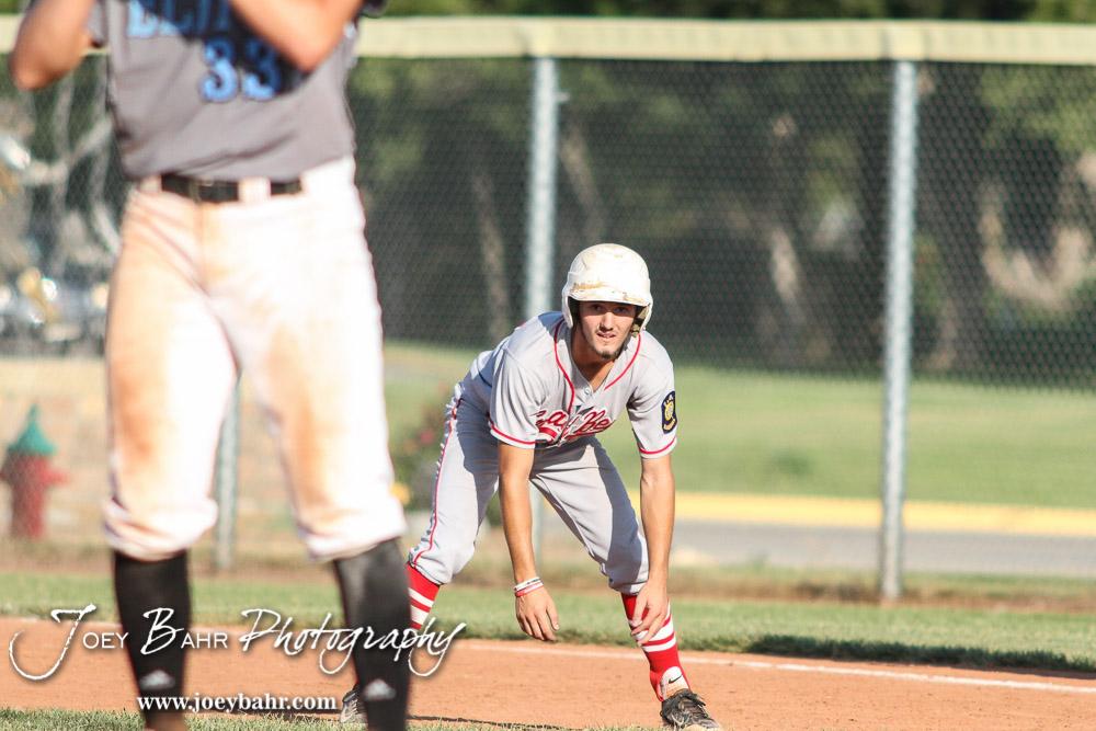 Great Bend Chief Kody Lang (#13) watches Garden City Elite Pitcher Sloan Baker (#33) for an opening to steal Second. The Great Bend Chiefs won the AAA Lower Zone 1 & 2 Tournament by defeating the Garden City Elite 10 to 4 at Great Bend Sports Complex in Great Bend, Kansas on July 18, 2016. (Photo: Joey Bahr, www.joeybahr.com)undefined