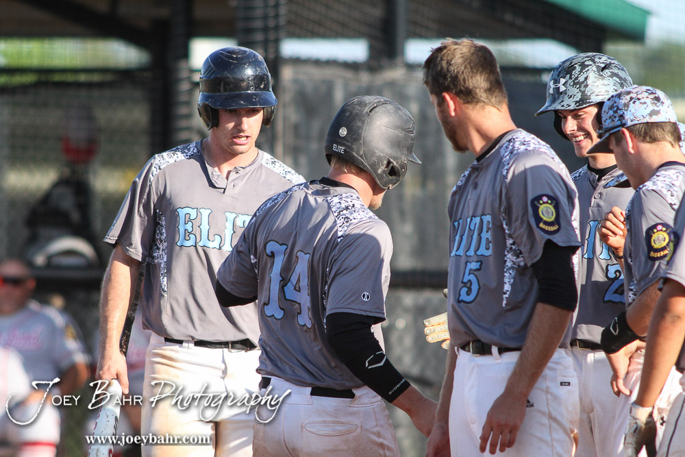 Teammates of Garden City Elite Casey English (#14) greet him at home plate after he hit a two run home run in the bottom of the Sixth Inning. The Great Bend Chiefs won the AAA Lower Zone 1 & 2 Tournament by defeating the Garden City Elite 10 to 4 at Great Bend Sports Complex in Great Bend, Kansas on July 18, 2016. (Photo: Joey Bahr, www.joeybahr.com)undefined