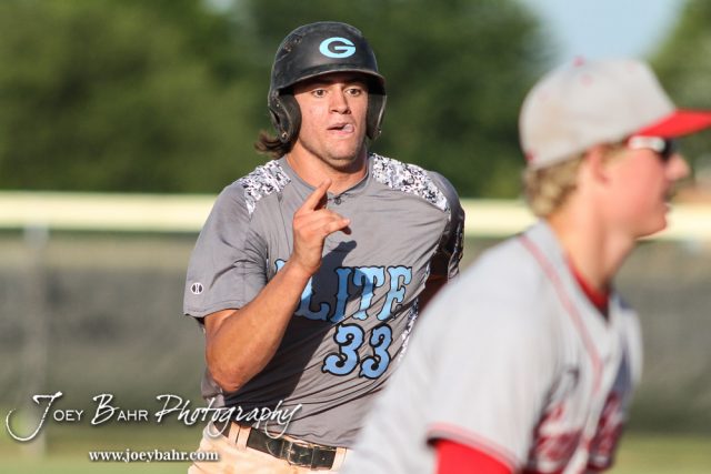 Garden City Elite Sloan Baker (#33) runs to steal Third Base in the bottom of the Sixth Inning. The Great Bend Chiefs won the AAA Lower Zone 1 & 2 Tournament by defeating the Garden City Elite 10 to 4 at Great Bend Sports Complex in Great Bend, Kansas on July 18, 2016. (Photo: Joey Bahr, www.joeybahr.com)undefined